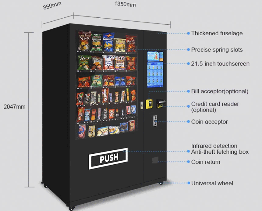 - 60 slots for snacks, drinks, and prepackaged items (e.g., chips, chocolates, bottled drinks).